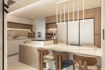 주방과 다이닝 공간은 이태리 수입 세라믹과 원목 질감의 가구 도어, 간살 도어를 조합해 깔끔한 공간을 연출했다. 또한, 입구 벽체에서 천장까지 레일 조명을 연결해 공간의 경계를 정리하면서도 조명 자체가 하나의 디자인 요소가 되도록 계획했다. 대형 아일랜드를 중심으로 조리와 식사가 자연스럽게 이어지도록 구성했으며, 메인 주방과 후면 보조 주방에 각각 싱크볼을 배치해 가족이 함께 사용하는 순간에도 동선이 겹치지 않도록 배려했다.